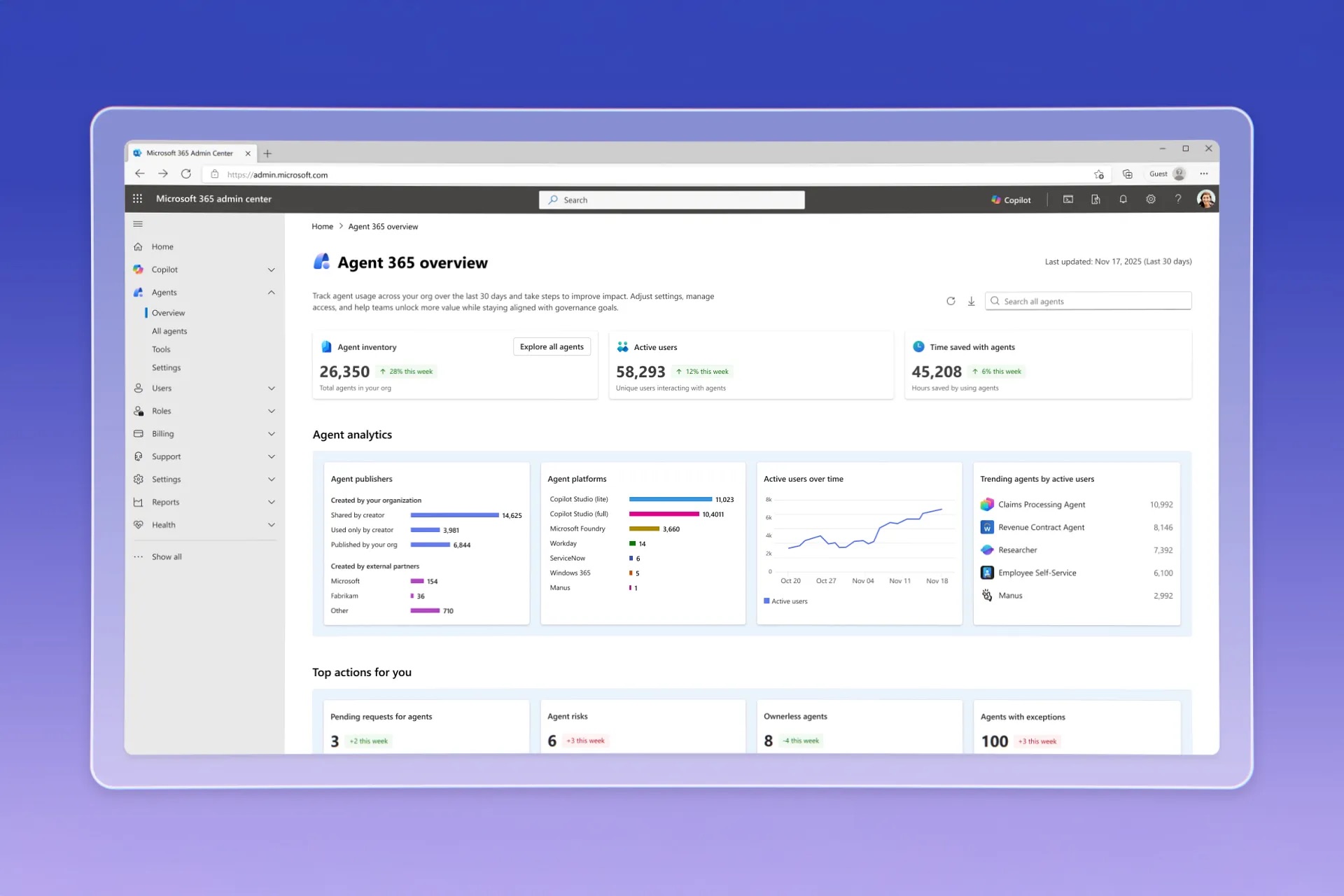 无论用户的智能体是使用Copilot Studio、Microsoft Foundry、开源框架,还是来自不断壮大的合作伙伴生态系统,包括Adobe、Manus、SAP、ServiceNow、Workday等创建的,Agent 365都能帮助用户安全地部署、组织和管理它们。