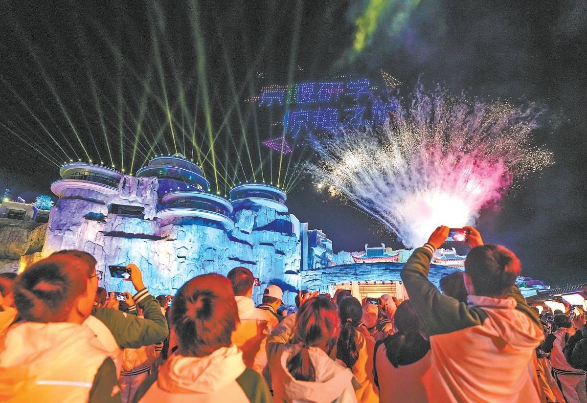 无人机在天空中摆出“京堰研学惊艳之旅”字样,引发学生欢呼